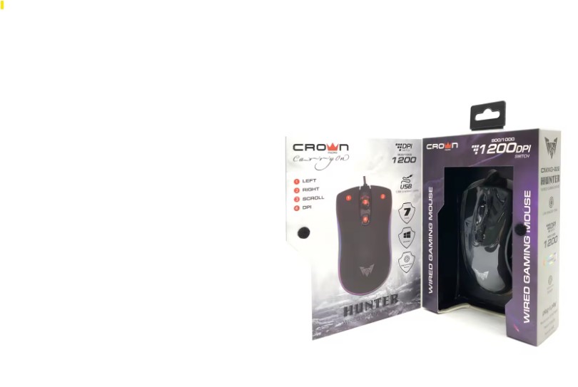 The CROWN CMXG-222 HUNTER wired gaming mouse is designed for smooth and responsive gaming performance. It features a precise optical sensor with adjustable DPI (1000–1200), colorful LED lighting, and an ergonomic design for comfortable long gaming sessions. With plug-and-play USB connectivity and a durable 1.5m cable, it offers reliable control for both gaming and everyday use.