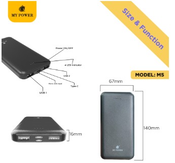 The My Power Bank M5 is a compact and reliable portable charger designed to keep your devices powered on the go. It offers efficient charging for smartphones, earbuds, and other USB-powered devices with stable output performance. Its lightweight and sleek design makes it easy to carry in a bag or pocket, making it perfect for travel, work, and daily use. With built-in safety features to protect against overcharging and short circuits, the My Power Bank M5 ensures safe and convenient charging whenever you need it.
